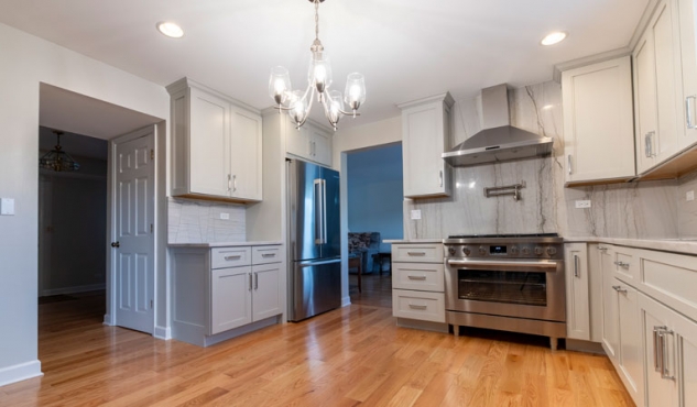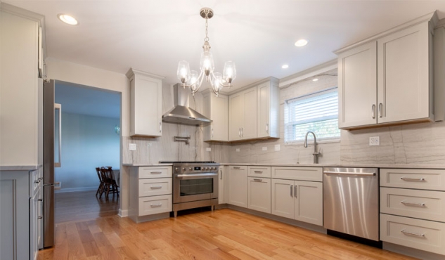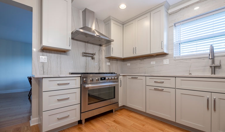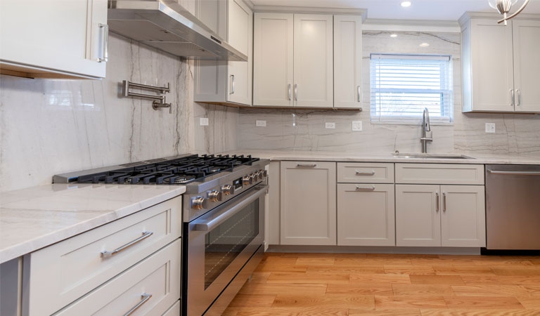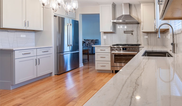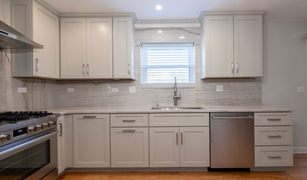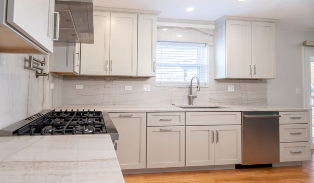 The cabinet door style is a lovely warm Ice Palisade from Candlelight, which stands out against the Cray shades quartz counters and backsplash.