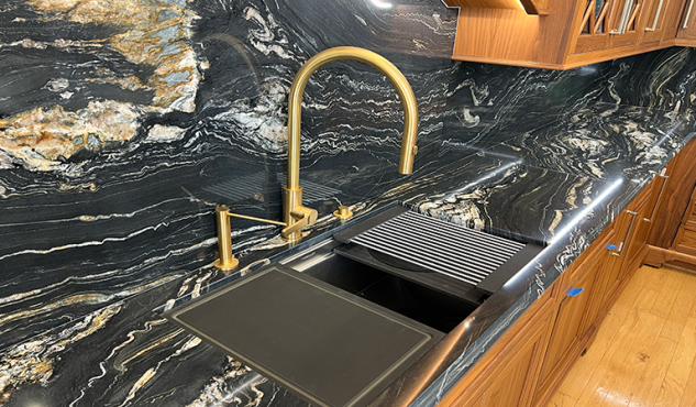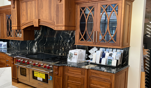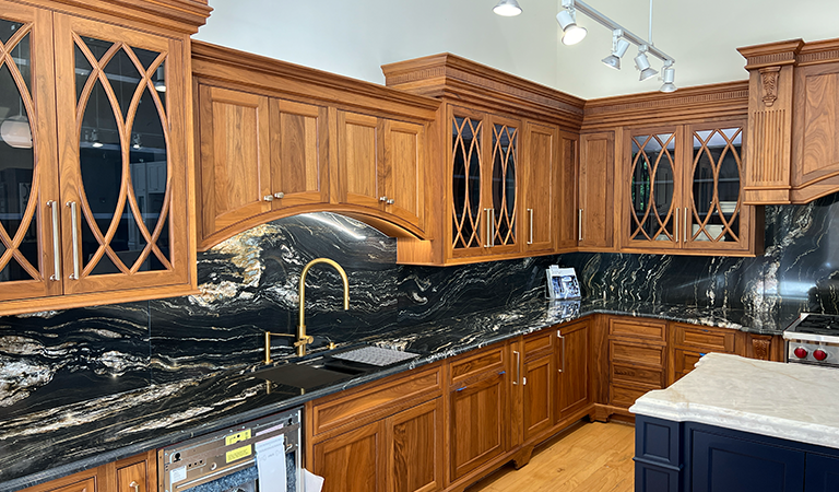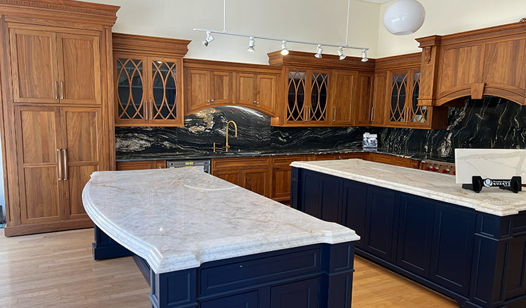 Revitalize your kitchen with timeless elegance. Our stunning Walnut Wood Species and quartzite countertops exude sophistication, while the vibrant blue island adds a pop of personality. Elevate your space and inspire guests to embark on their dream kitchen remodel today!