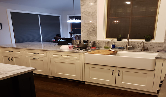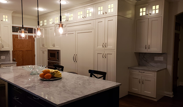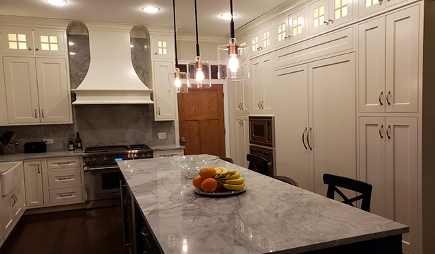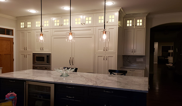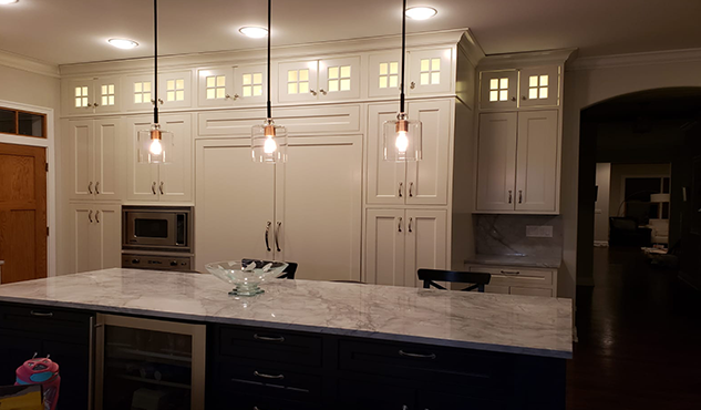 This stunning kitchen design will make you want to take cooking lessons! Our client let us run free with this design! It has all the bells and whistles. We used Crystal Brand cabinets painted bisque - the island is navy blue.